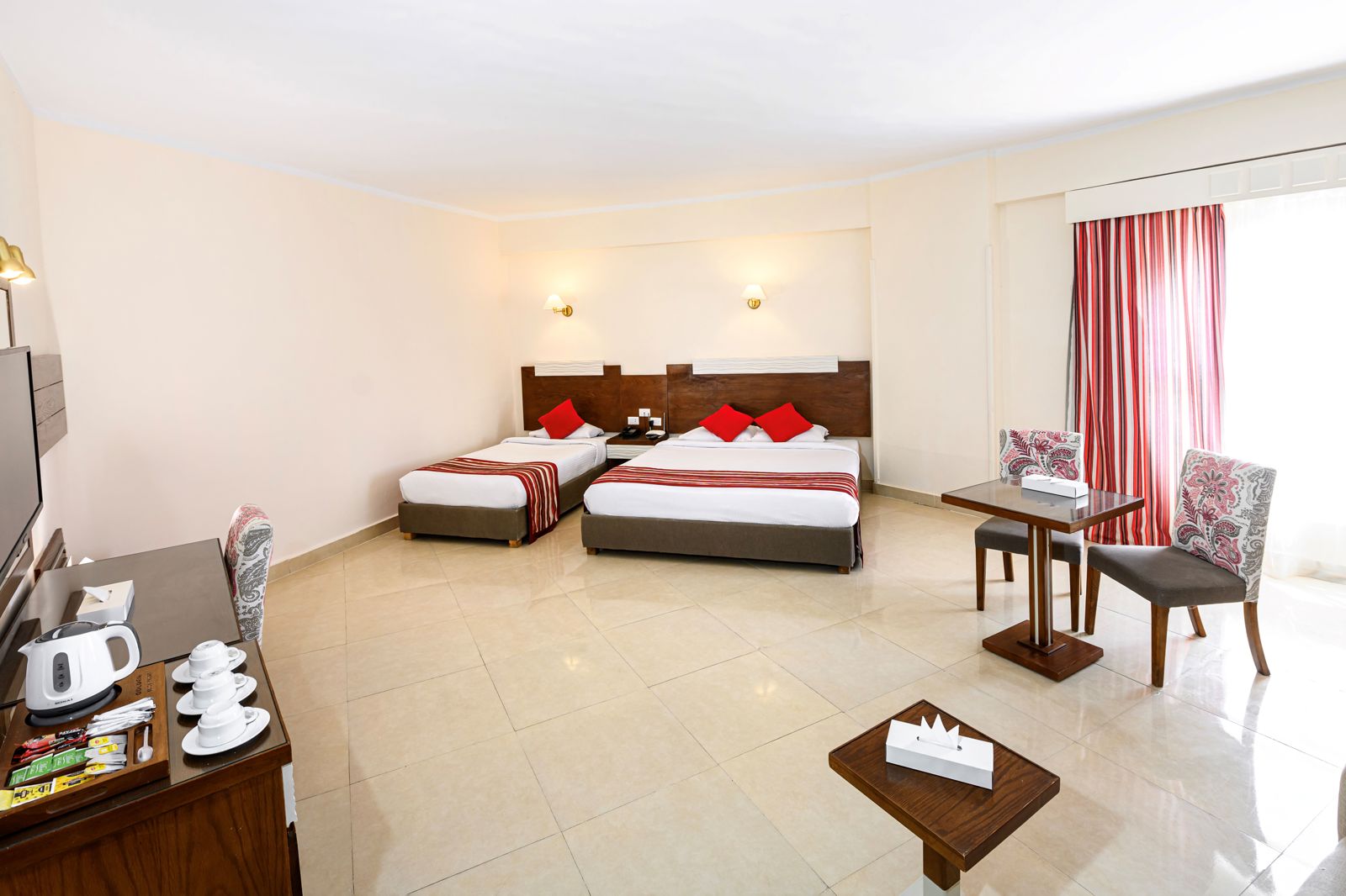 Golden Beach Resort, voorheen bekend als Movie Gate Golden Beach, ligt direct aan de Rode Zee en biedt een prachtig uitzicht op het kristalheldere water. Het resort beschikt over een privéstrand en meerdere zwembaden, waaronder een met glijbanen, wat zorgt voor volop waterplezier voor zowel volwassenen als kinderen. Culinaire liefhebbers kunnen terecht in diverse restaurants die variëren van internationale buffetten tot à-la-carte opties. Voor ontspanning zijn er spa-faciliteiten en voor de actievelingen zijn er sportmogelijkheden zoals tennis en beachvolleybal. Golden Beach Resort combineert comfort en entertainment voor een onvergetelijke vakantie aan de Rode Zee.