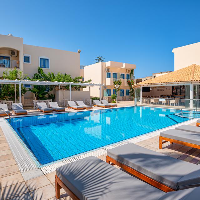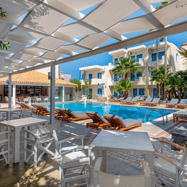 Bij het zwembad staan ligbedden en parasols maar ook de gezellige bar van Nikos en Angela. Overdag is het heerlijk toeven in de zon, met een koud drankje binnen handbereik. In de avond wandel je zo naar het centrum van Analipsis, waar je volop keuze hebt uit sfeervolle restaurantjes. Of blijf gewoon bij Nana-Angela: ook de menukaart van de bar is het ontdekken waard.