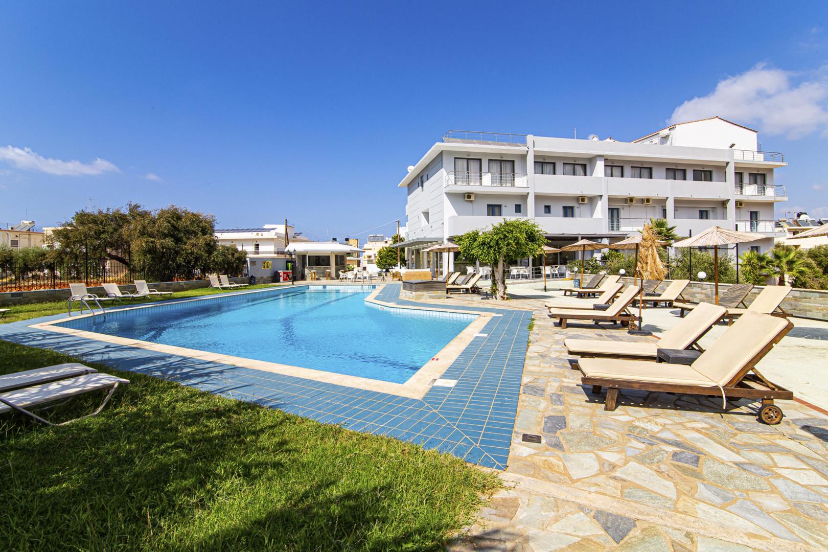 Ben je op zoek naar een comfortabel verblijf in het levendige Malia? Dan is het 3-sterrenhotel Hermes Malia de perfecte keuze. Dit hotel biedt een ideale mix van ontspanning en avontuur op het prachtige Kreta. Met een uitnodigend zwembad en een gezellige bar is het de ideale plek om te ontspannen na een dag vol ontdekkingen. De nabijheid van het bruisende nachtleven van Malia maakt het een uitstekende keuze voor vakantiegangers die van gezelligheid houden. Bovendien ligt het strand op korte afstand, zodat je kunt genieten van zon, zee en strand. Boek vandaag nog je verblijf bij D-reizen en beleef een onvergetelijke vakantie in Hermes Malia!