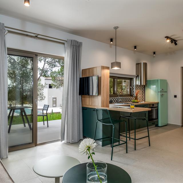 Wat een mooi, modern adres is Akrotiri Suites. Als je hier binnenwandelt, zie je direct het uitnodigende zwembad liggen met daaromheen comfortabele ligbedden om uren op te luieren in het zonnetje. De tuin waarin de suites liggen is strak aangelegd en de vele bomen die er staan zorgen voor die heerlijke schaduw op een hete zomerdag.