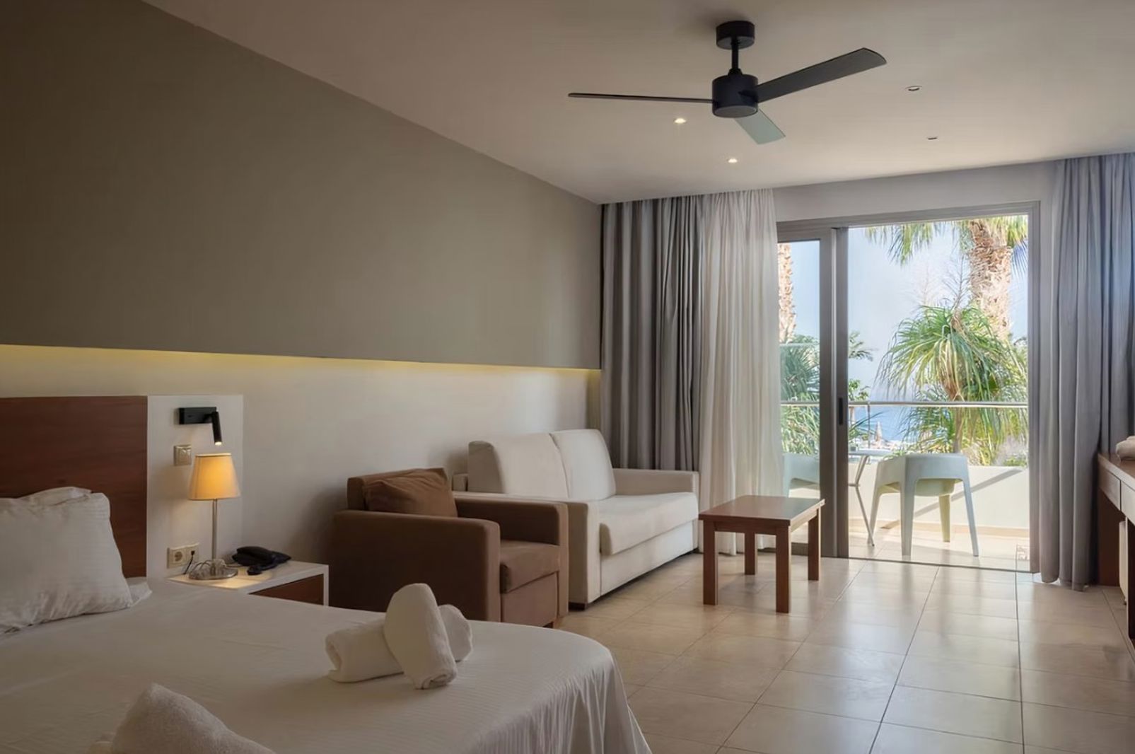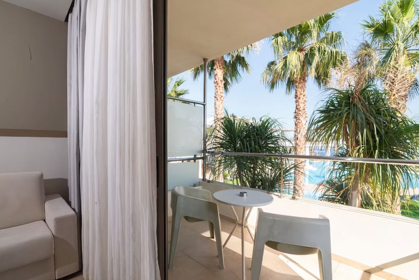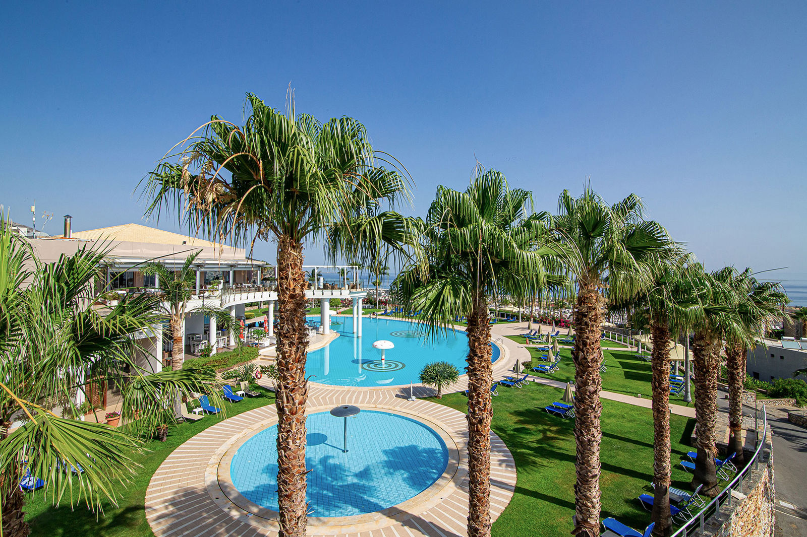 In het hotel blijven kan ook, want er is een prachtig zwembad en een mooi aangelegd hip terras. Hier is het de hele dag goed toeven. Het wat hoger gelegen terras heeft een nog mooier uitzicht over zee en de kust. Naast het zwembad zit de leuke, ronde bar waar de barman graag jouw lievelingsdrankje serveert. Als je tussen de middag trek hebt in wat lekkers, bestel je dit buiten op het terras, maar dan bij de snackbar, handig!