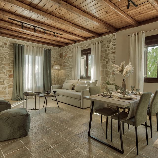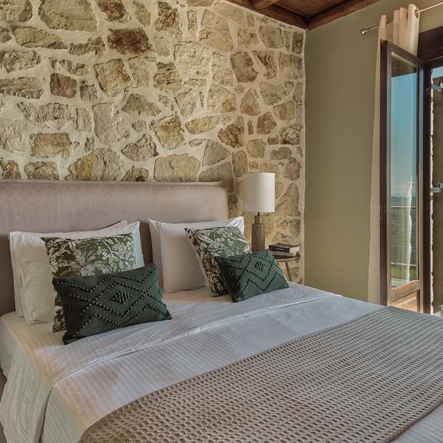 ‘Kijk lekker rond, en als je nog verse groenten nodig hebt, moet je maar eens achter de villa kijken!’ hoor ik de eigenaresse nog net zeggen terwijl ik met een sleutel in de hand op de drempel van mijn appartement sta. Deze nieuwe villa is echt een plaatje! Verscholen in de bergen, aan de rand van het dorp ligt Agrikia Villas: één villa met drie appartementen gebouwd in de traditionele stijl met natuurlijke materialen. De villa is tegen de berg aangebouwd, en omgeven door een wijds en prachtig uitzicht over de vallei, wat zich uitstrekt tot aan de kust. ‘Gezellig!’ verzucht ik als ik binnen rondkijk. De open haard en gezellige landelijke inrichting geven me een huiselijk gevoel. ‘Dit gaat een heerlijk ontspannend weekje worden!’