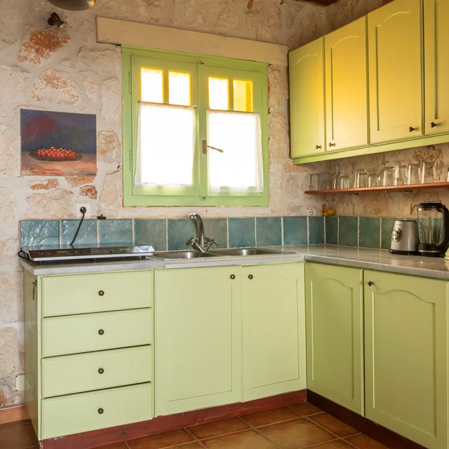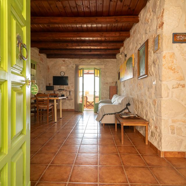 En nu, jaren later, zijn ze dat nog steeds. En ik ook. Net als het zwembad en de zeven appartementen heeft ook mijn balkon uitzicht over de azuurblauwe zee. Overal waar je kijkt, proef je de liefde van de eigenaren. De inrichting van de appartementen is in de stijl van de streek met houten plafonds, oude natuursteen, ik heb zelfs een hemelbed. Efthimios organiseerde alles: van de eerste steen tot zijn zelfgemaakte kleurrijke schilderijen.