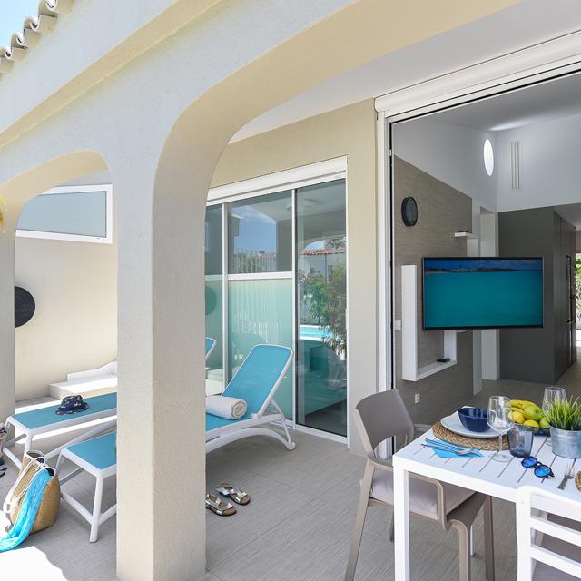 Bungalows Velsuites is een mooi, modern adresje waar je heerlijk kunt ontspannen. Als ik de strak gedecoreerde woonkamer uitkom, wandel ik zo mijn eigen terras op. Hier kan ik naar hartenlust luieren en iedere dag beginnen met een smakelijk, zelf klaargemaakt ontbijtje. Daarna neem ik graag een duik in het zwembad, dat zich op slechts een paar passen bevindt.