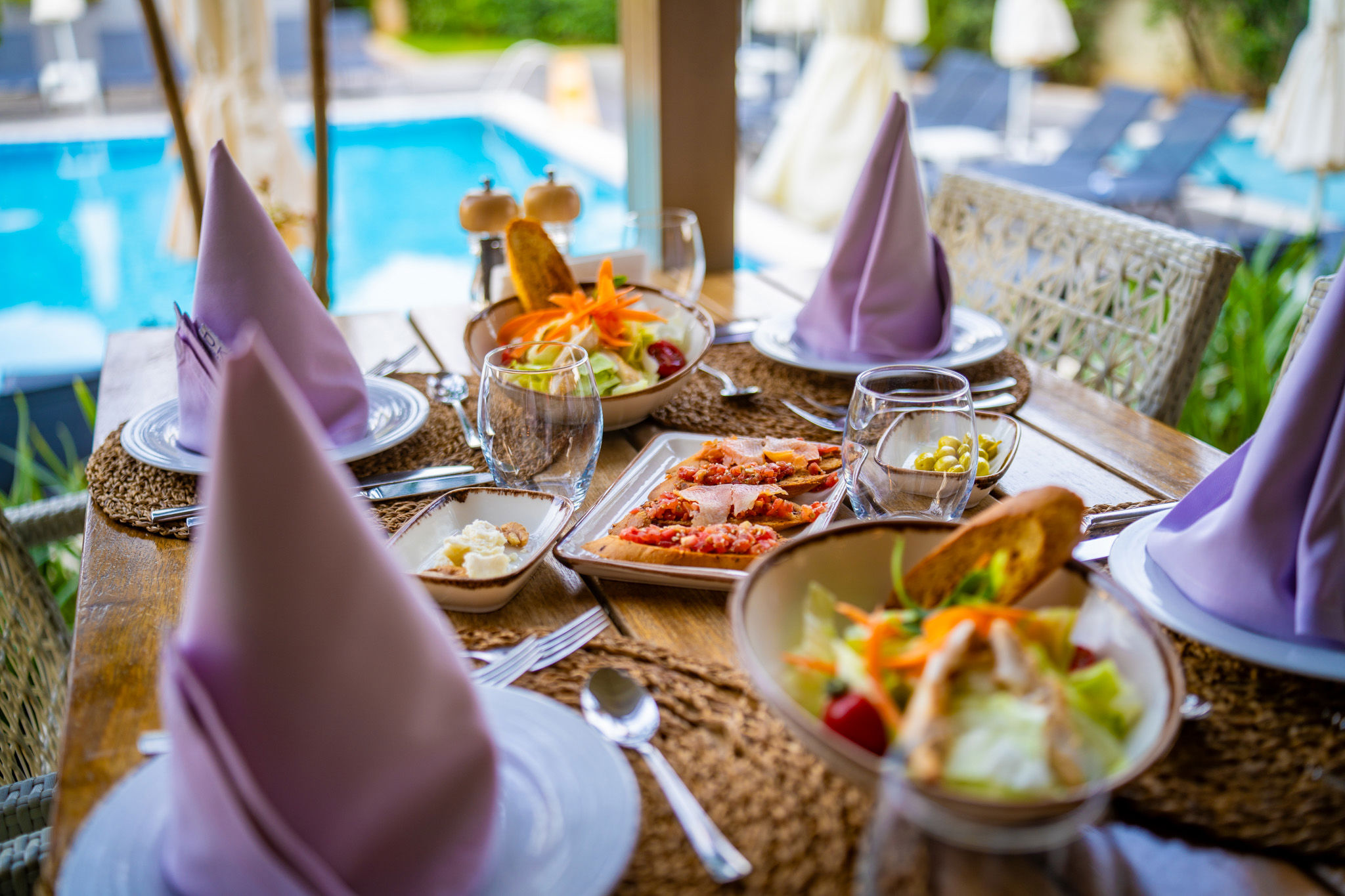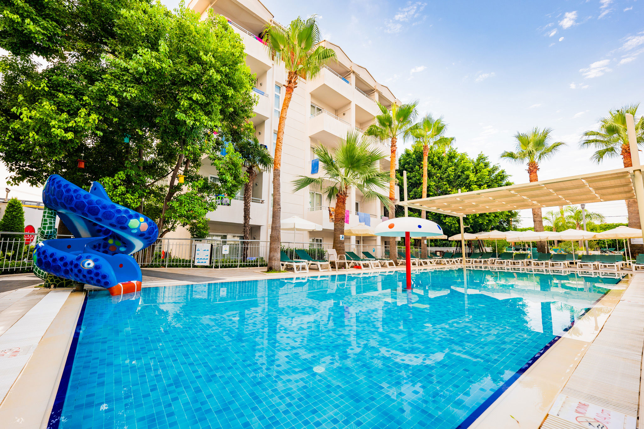 De tuin is echt prachtig: het lijkt wel alsof je op een tropisch eiland bent aangekomen. Er zijn vier grote zwembaden die door middel van bruggetjes aan elkaar verbonden zijn. Deze bruggetjes leiden naar diverse faciliteiten, waaronder de poolbars. Twee kleinere badjes met splash pool zijn perfect voor de kleinste vakantiegangers. Net als de kleurrijke miniclub!